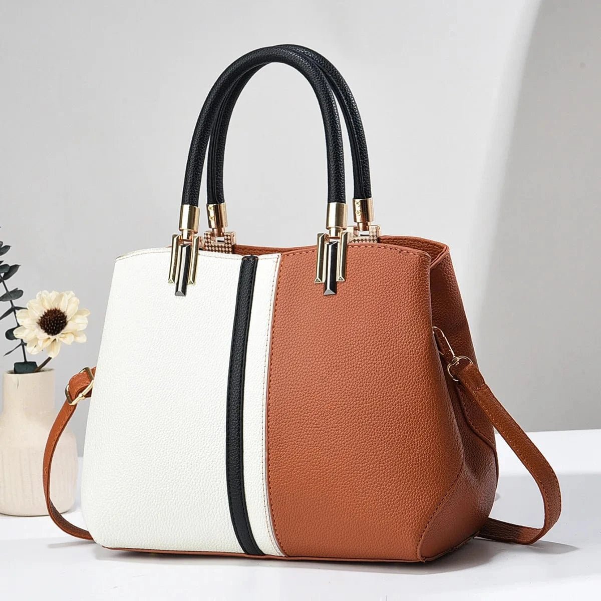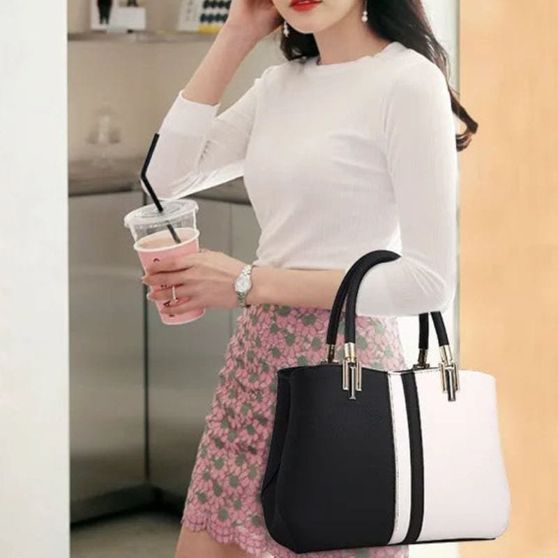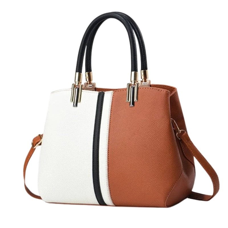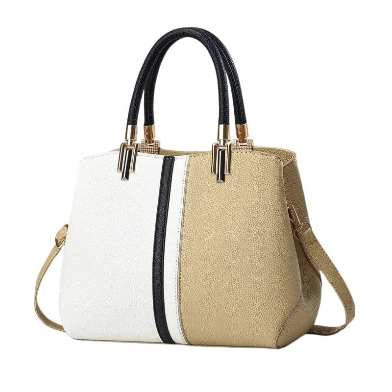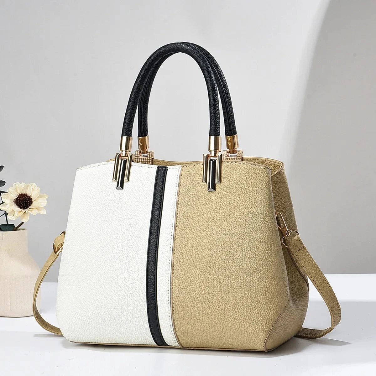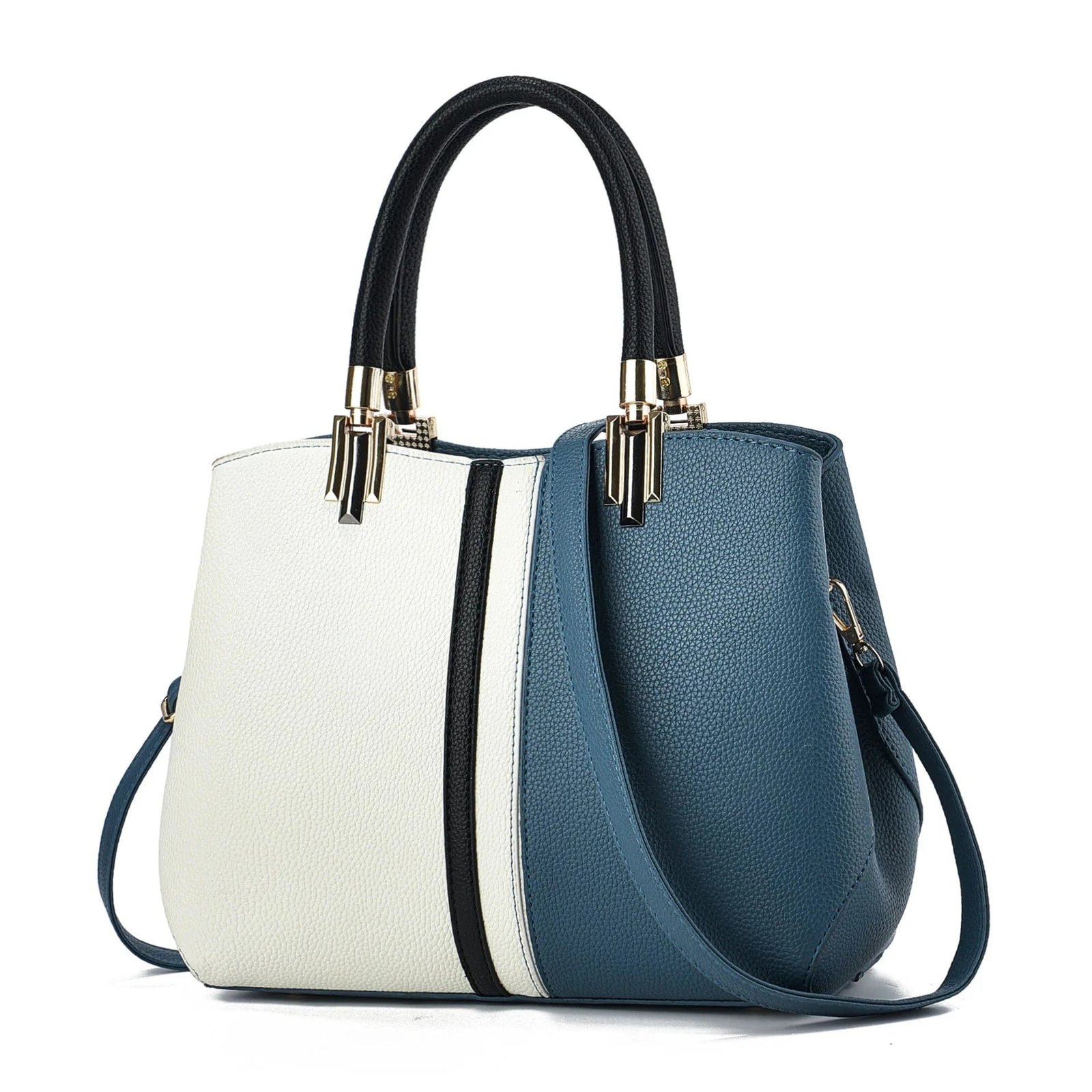 Denna märkeshandväska för damer är en perfekt kombination av lyx och modern design. Tillverkad av högkvalitativt PU-läder, har den en unik färgblockdesign i blått, vitt och svart, vilket ger en elegant och sofistikerad look. De guldfärgade detaljerna, tillsammans med dubbla handtag och en justerbar axelrem, gör väskan både stilfull och praktisk. Perfekt för både arbete och fest, där du vill ha en exklusiv men funktionell accessoar.
